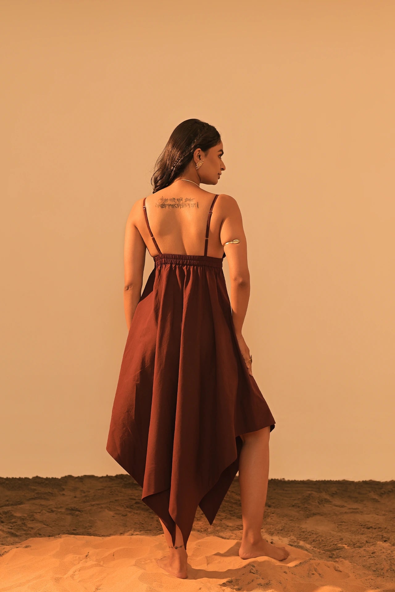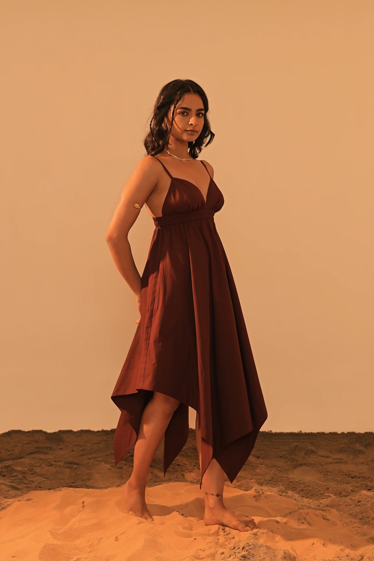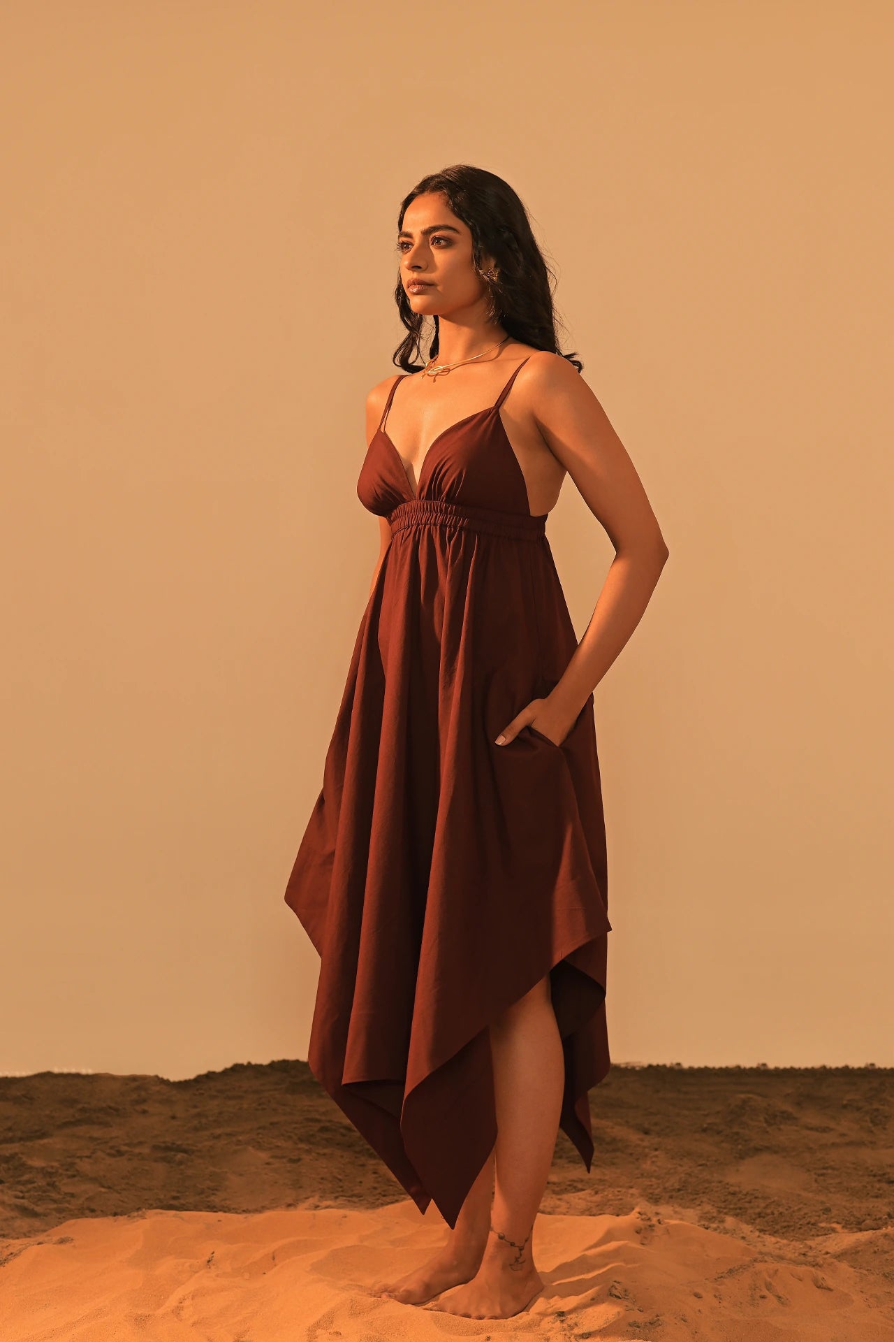 - Design: Hand-dyed coffee-brown, V-neckline, elasticated under-bust, side pockets