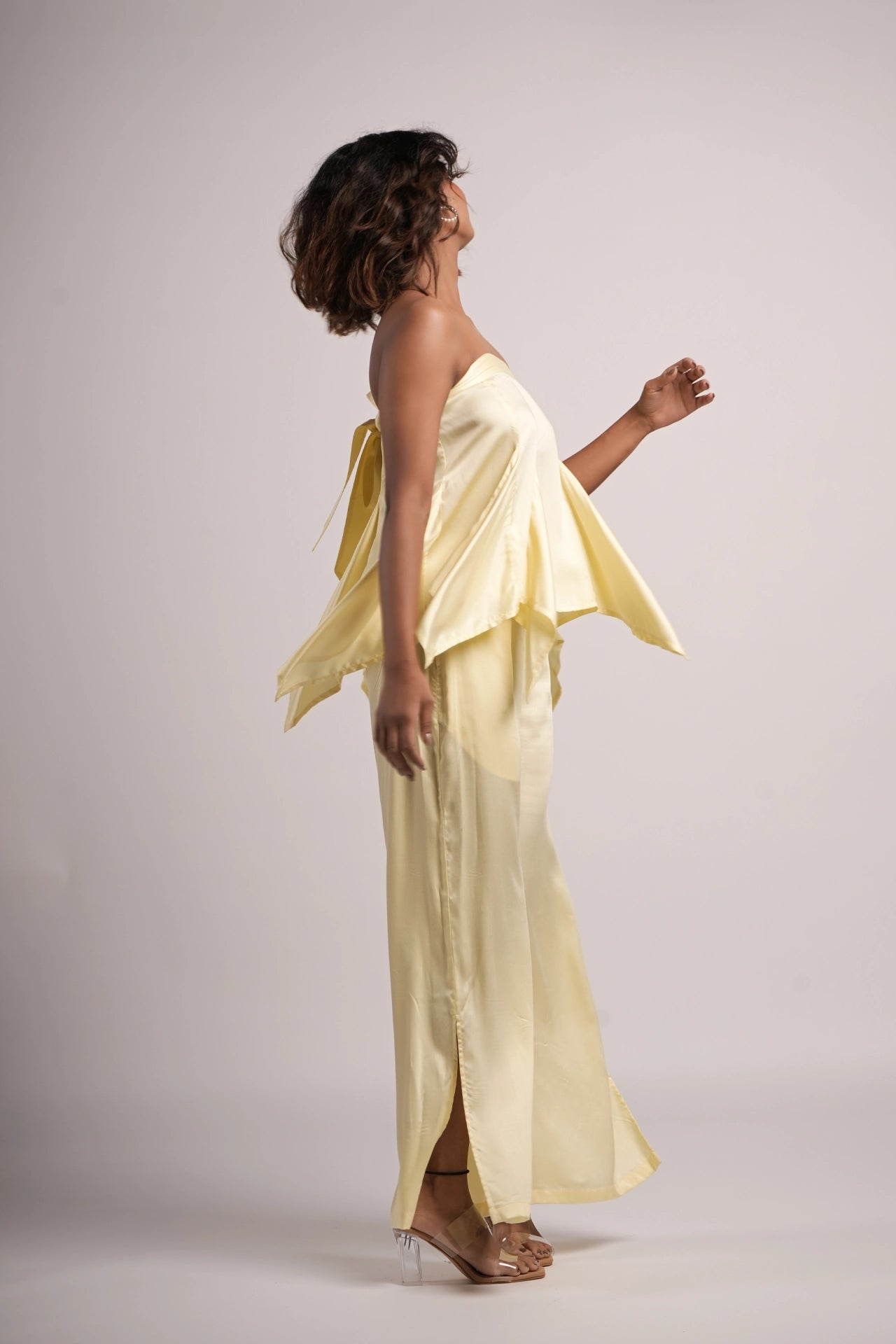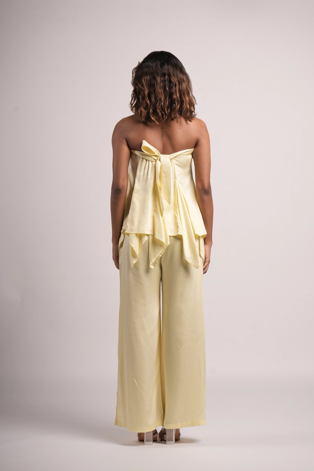 Design: Strapless top with asymmetric hem + flowing wide-leg trousers