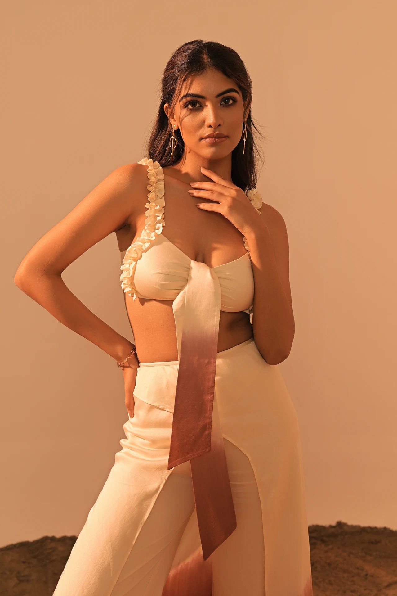 - Design: Beige-brown ombre, front tie-up detail, ruffle straps