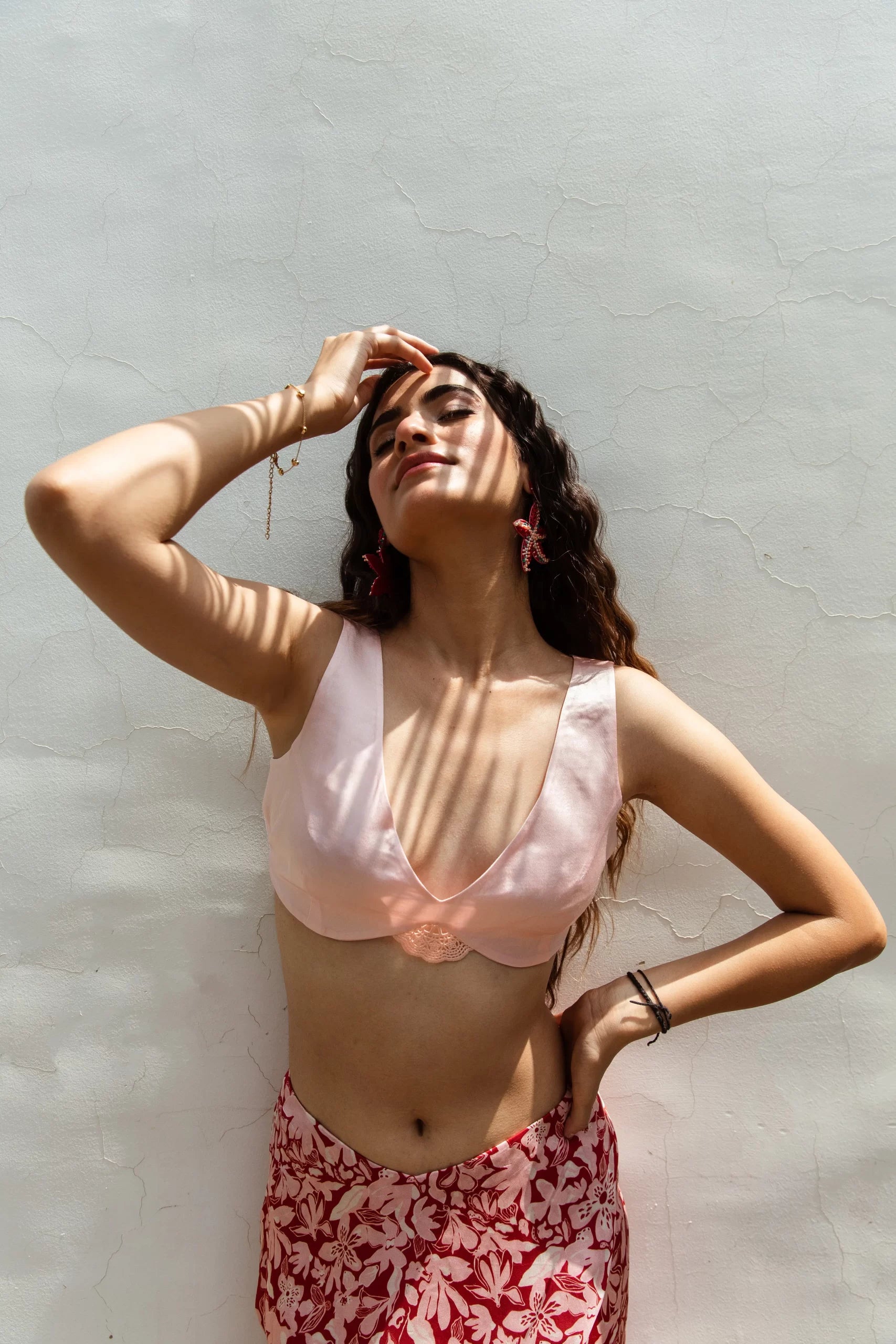 - Design: Plunging V-neckline, cotton lace center, fabric button closure