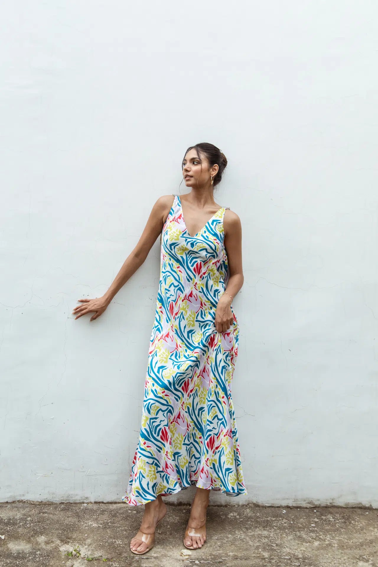 - Design: Vibrant tropical print, buckle clasps at shoulders, deep back cowl