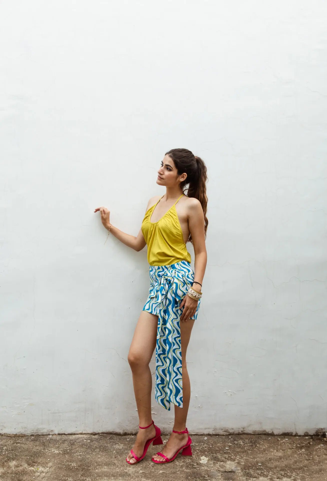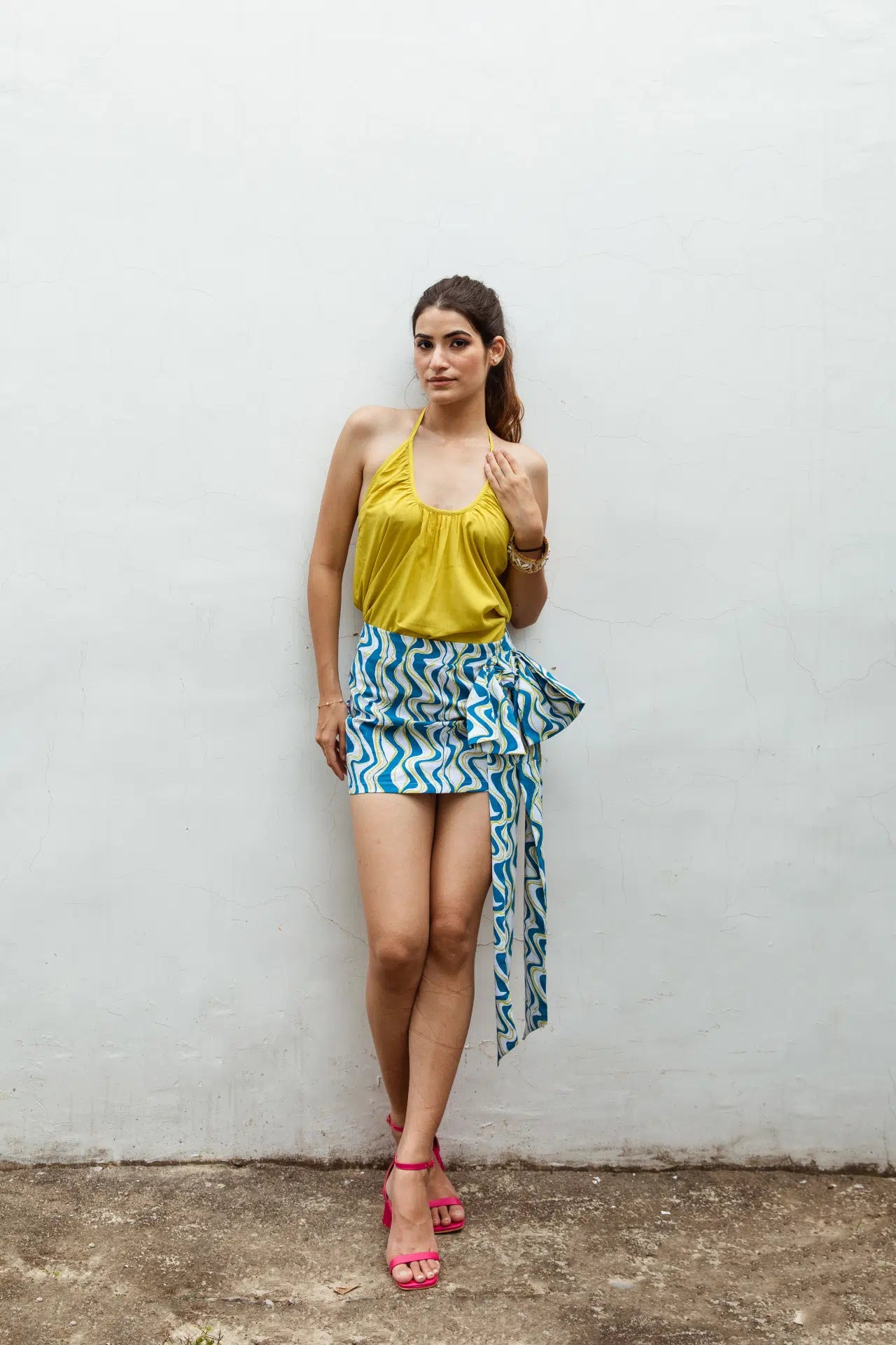 Introducing our Aqua Lime Ripple Print Mini Skirt—crafted in Cotton Lycra for stretch and convenience. Its dramatic bow detail adds uniqueness to this mini-length dress, perfect from brunch to dinner dates. Comfort and chic combined in one loveable piece!