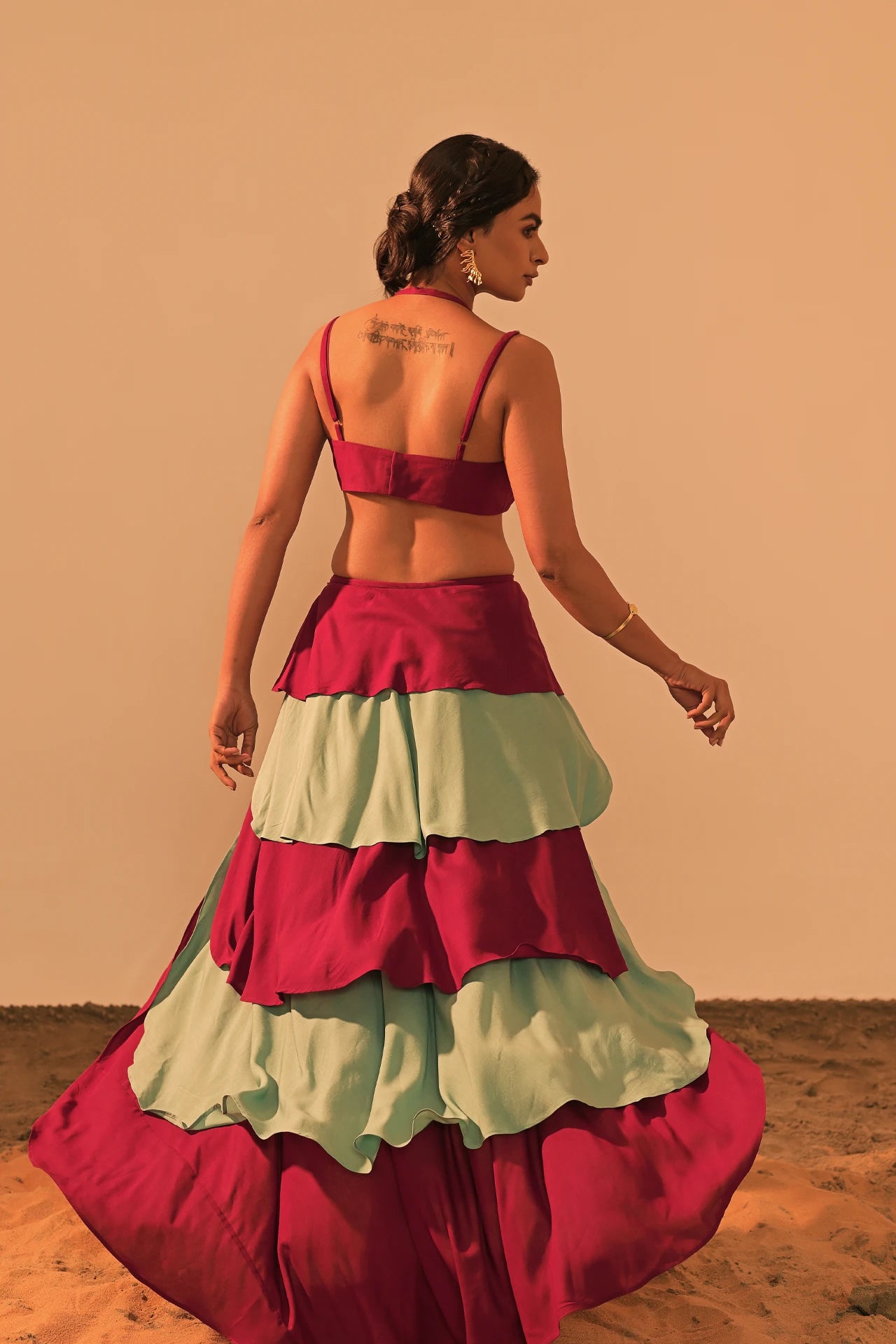 Design: Unique burgundy and turquoise tiered design, flowy and drapey silhouette, side U-cuts