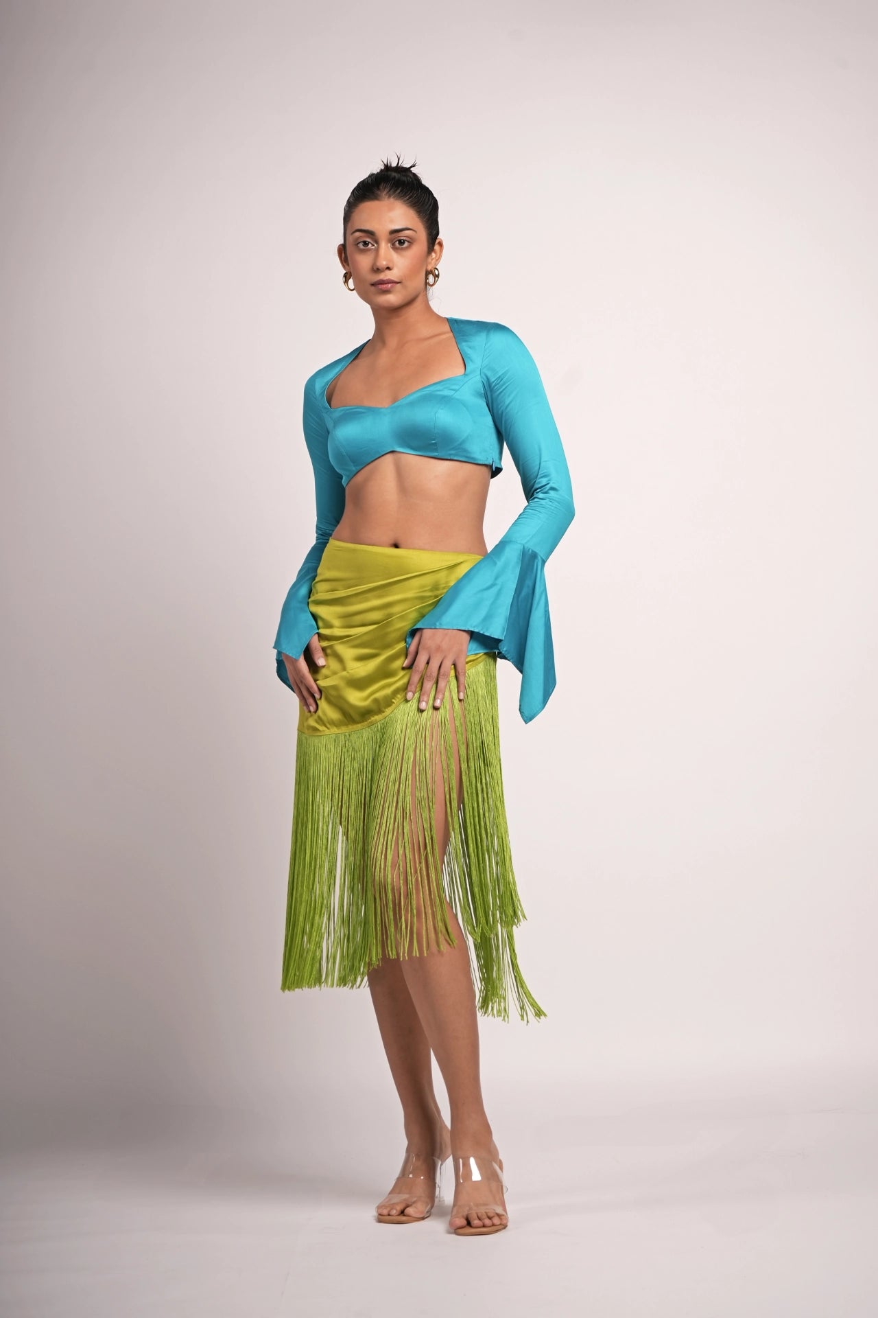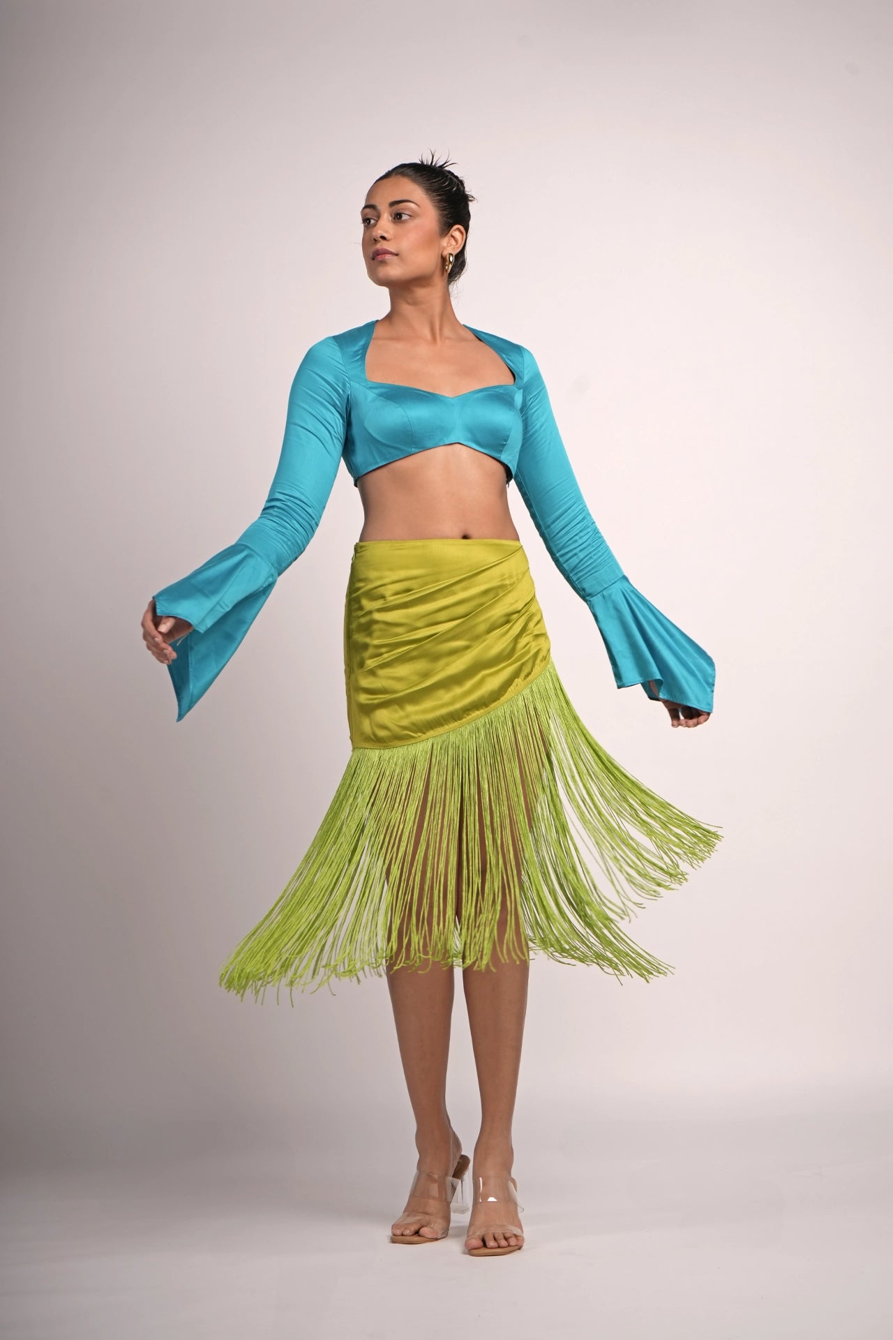 Detail: Ruched lime skirt with playful fringe detailing for movement; side zip fastening for a sleek finish