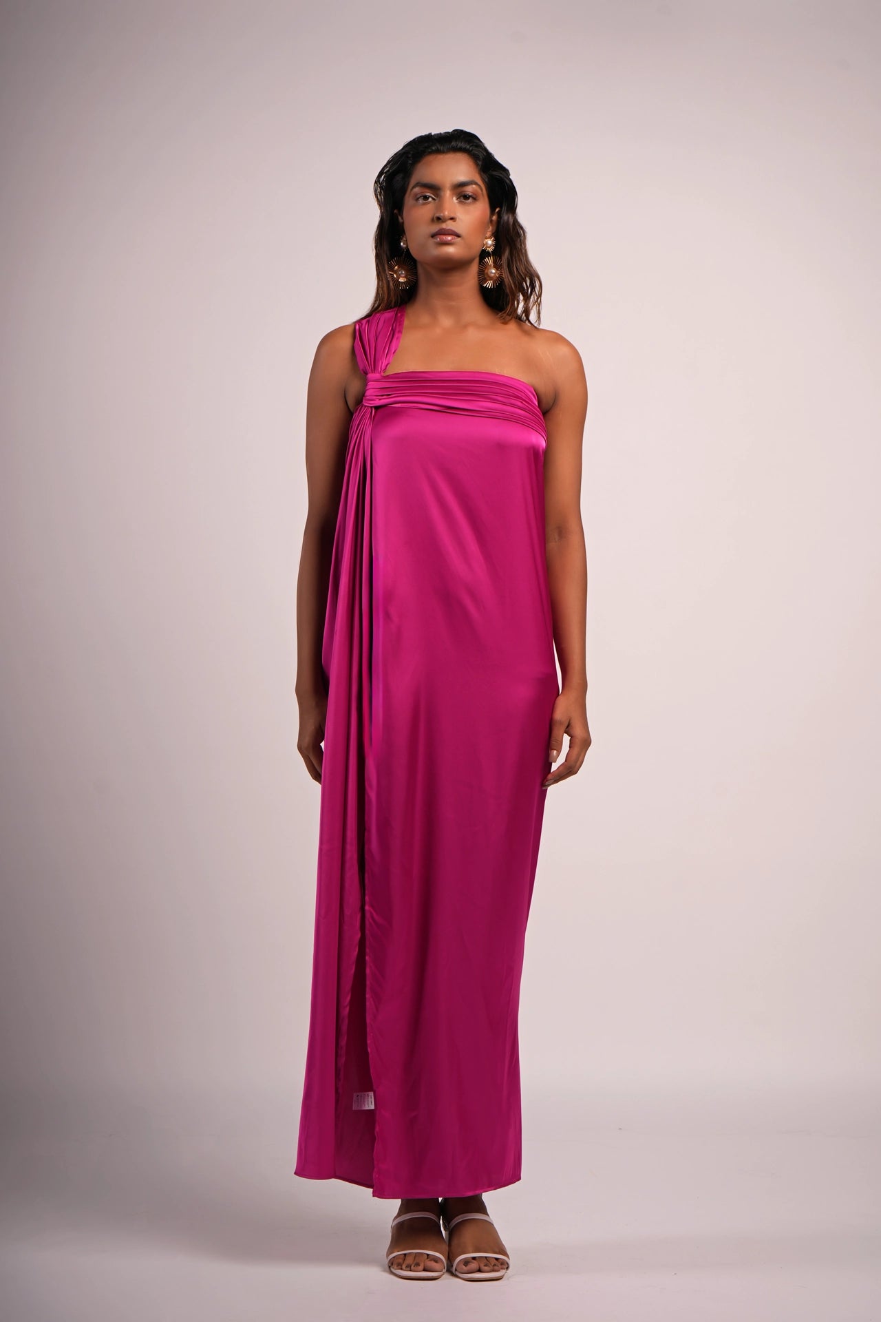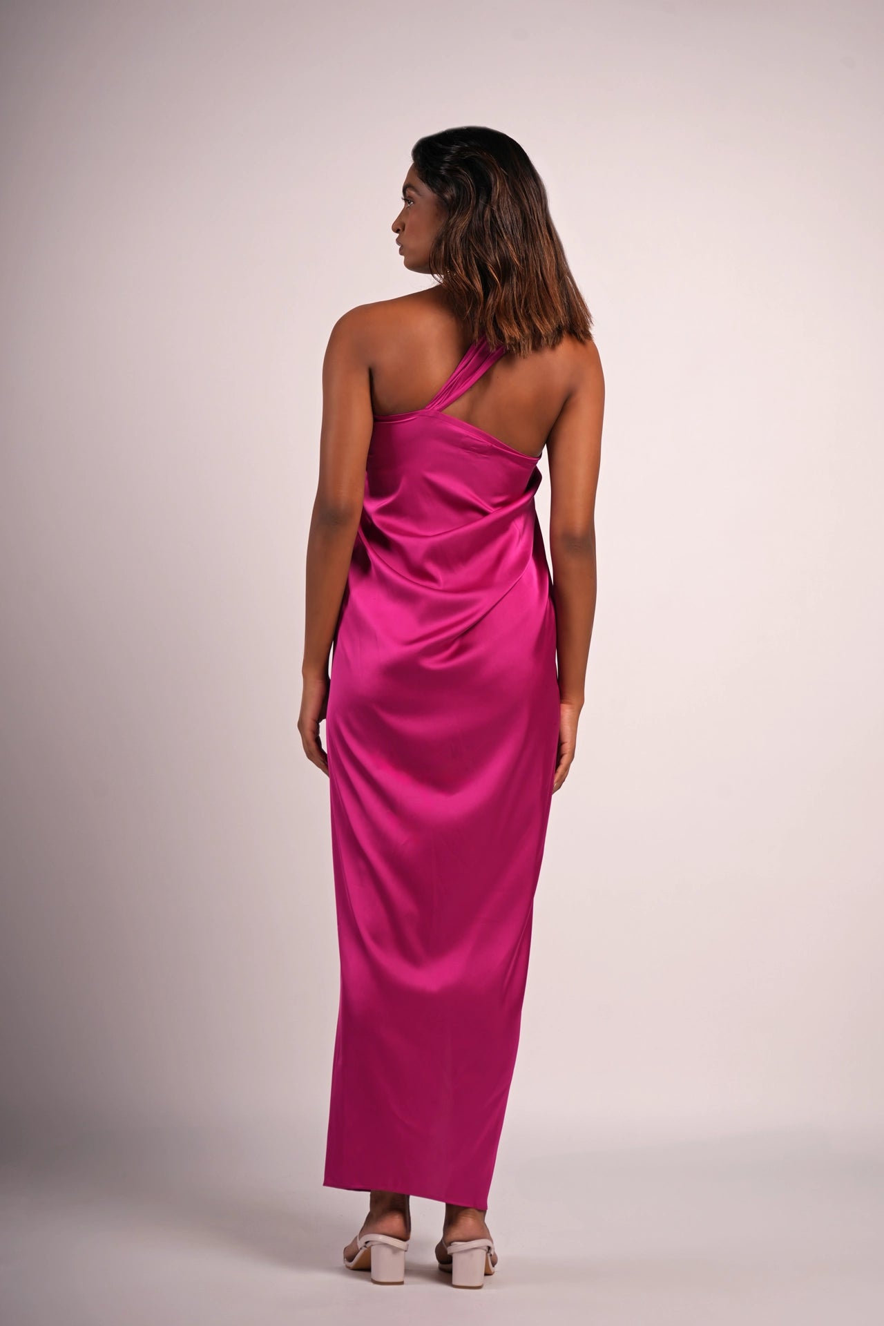 Material: Fluid, glossy satin in a rich orchid Magenta hue that catches the light with every move