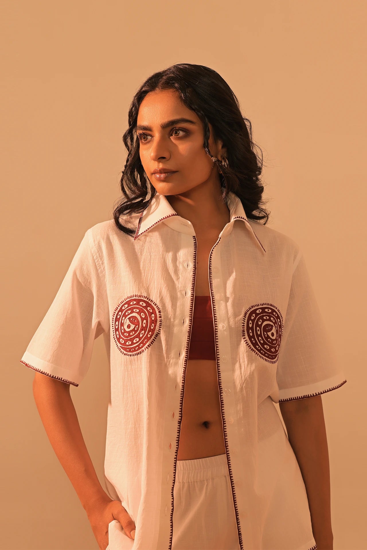 - Overshirt: Collared, half-sleeve with bold burgundy snake motif