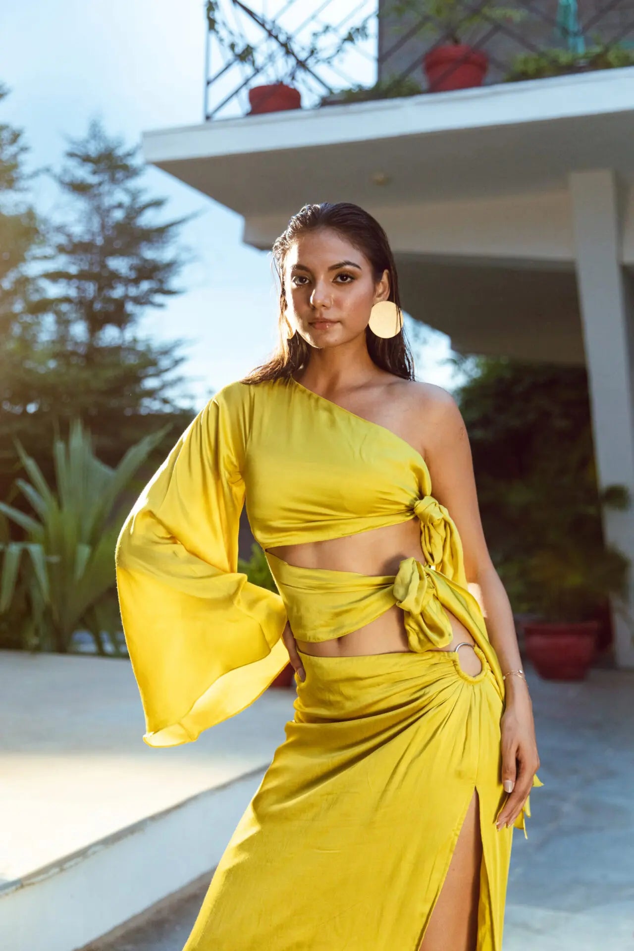 Design: One-shoulder tie-up, metal ring detail & thigh-high slit